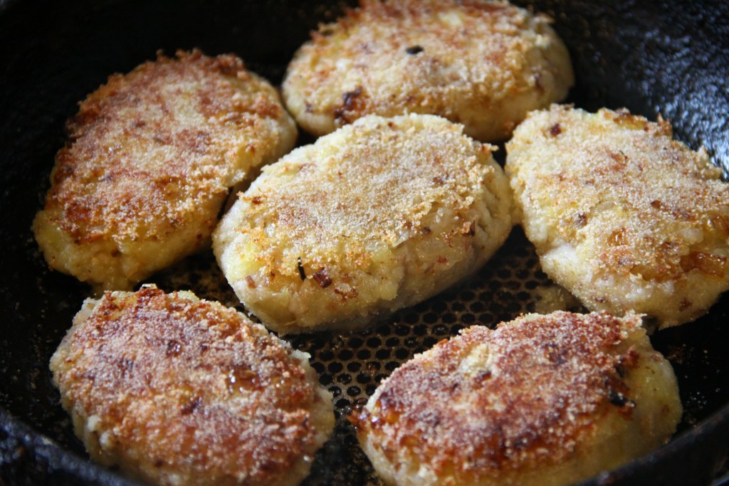 Из фарша сформировать руками котлетки, обвалять их в панировочных сухарях. Выложить на сковороду, разогретую с растительным маслом, и обжарить на небольшом огне с двух сторон до румяной корочки.