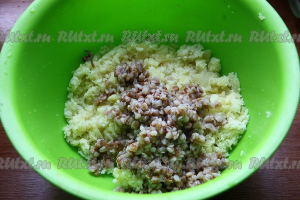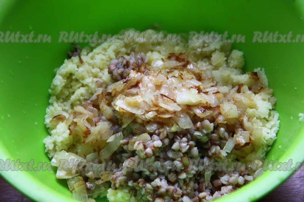 Мелко нарезанный лук обжарить на растительном масле, помешивая, до золотистого цвета, затем выложить к картошке и гречке, добавить соль и перец по вкусу.