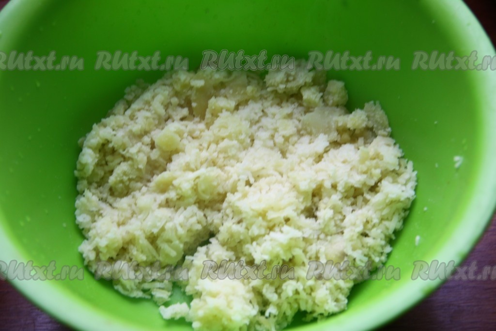 Вымыть картофель и, залив водой, отварить в кожуре до готовности, затем очистить и натереть на мелкой терке.