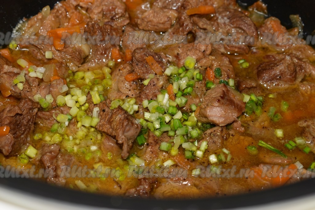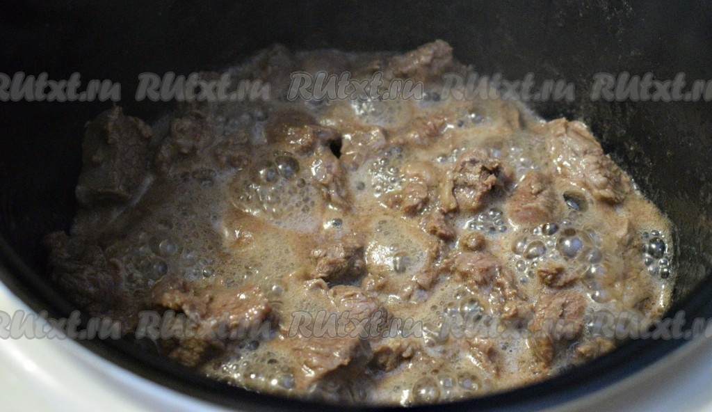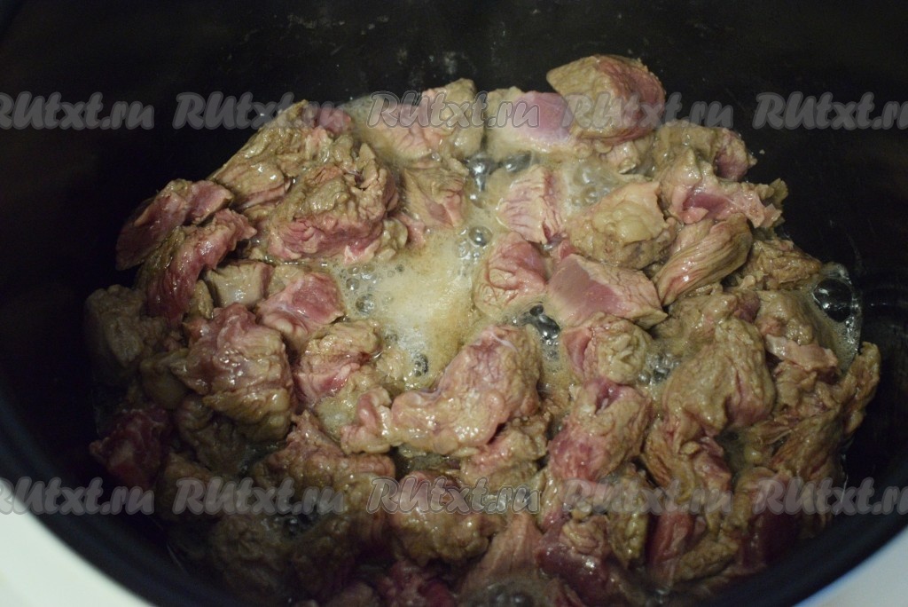 Закрываем крышку и тушим 1 час, не открывая мультиварку. Затем открываем крышку, солим, перчим мясо и, если потребуется, то добавляем еще воду.