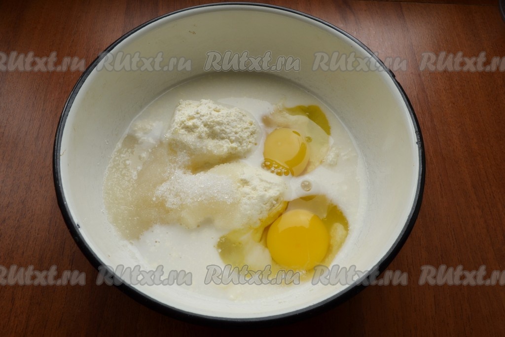 Сюда же добавить сырые яйца, соль и оставшийся сахар.