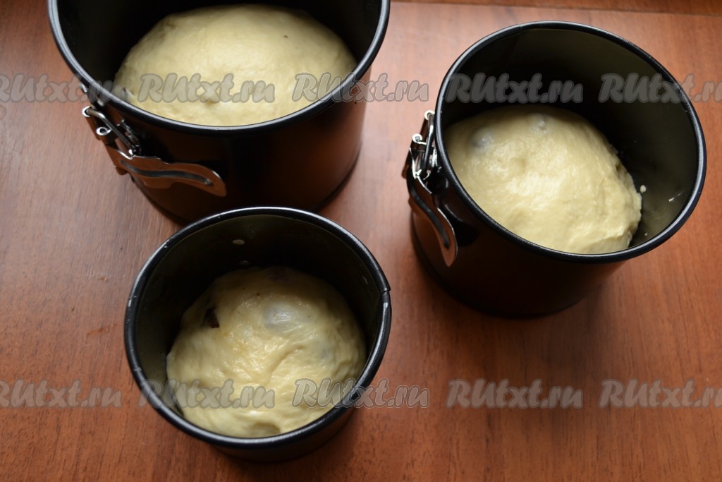 Формы для куличей смазать растительным маслом, на дно поместить пергамент. Тесто обмять и разложить его по формам, заполняя на 1/3 объема.