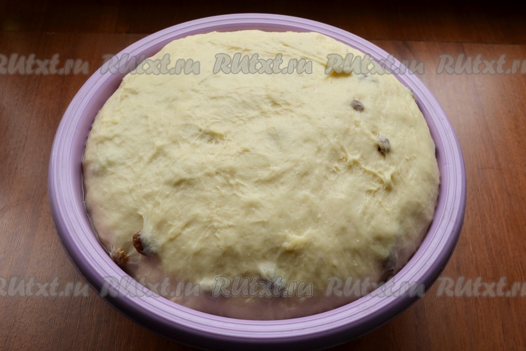 Также добавить в тесто изюм и хорошо тесто вымесить, подсыпая муку. Тесто будет липким, но больше, чем указано в рецепте, муки не добавлять. В итоге тесто будет нежным, мягким и чуть липнущим.