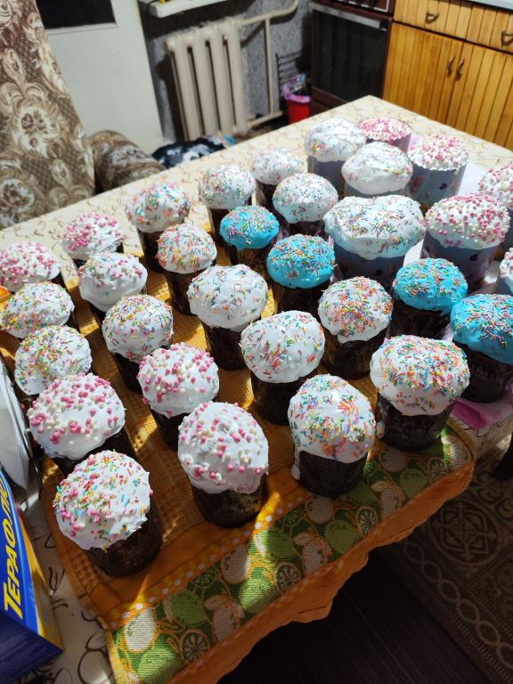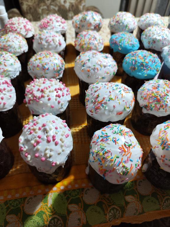 Далее невероятно нежные, воздушные и ароматные творожные куличи "Пасхальные" покрыть глазурью (можно украсить куличи белковой глазурью) и посыпать кондитерской присыпкой. Оставить куличи "дозревать" не менее, чем на сутки, обернув их пищевой пленкой или поместив в целлофановый пакет. Отличные куличи получаются!