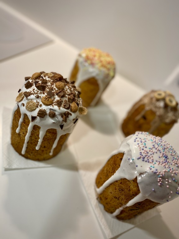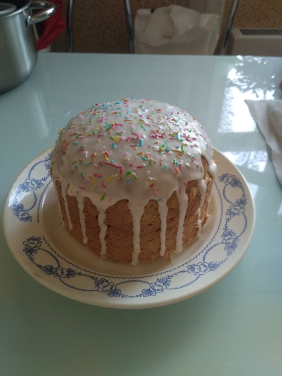 Далее невероятно нежные, воздушные и ароматные творожные куличи "Пасхальные" покрыть глазурью (можно украсить куличи белковой глазурью) и посыпать кондитерской присыпкой. Оставить куличи "дозревать" не менее, чем на сутки, обернув их пищевой пленкой или поместив в целлофановый пакет. Отличные куличи получаются!