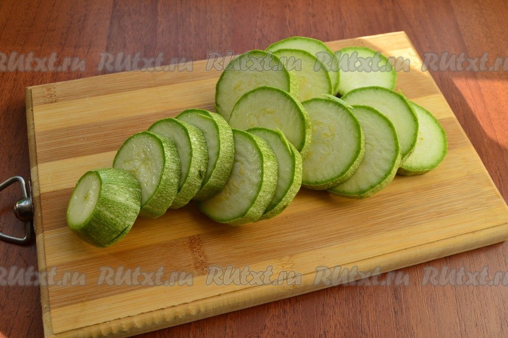 Кабачки нарезать кружками толщиной около 1 см (молодые кабачки можно не очищать от кожуры), посолить.