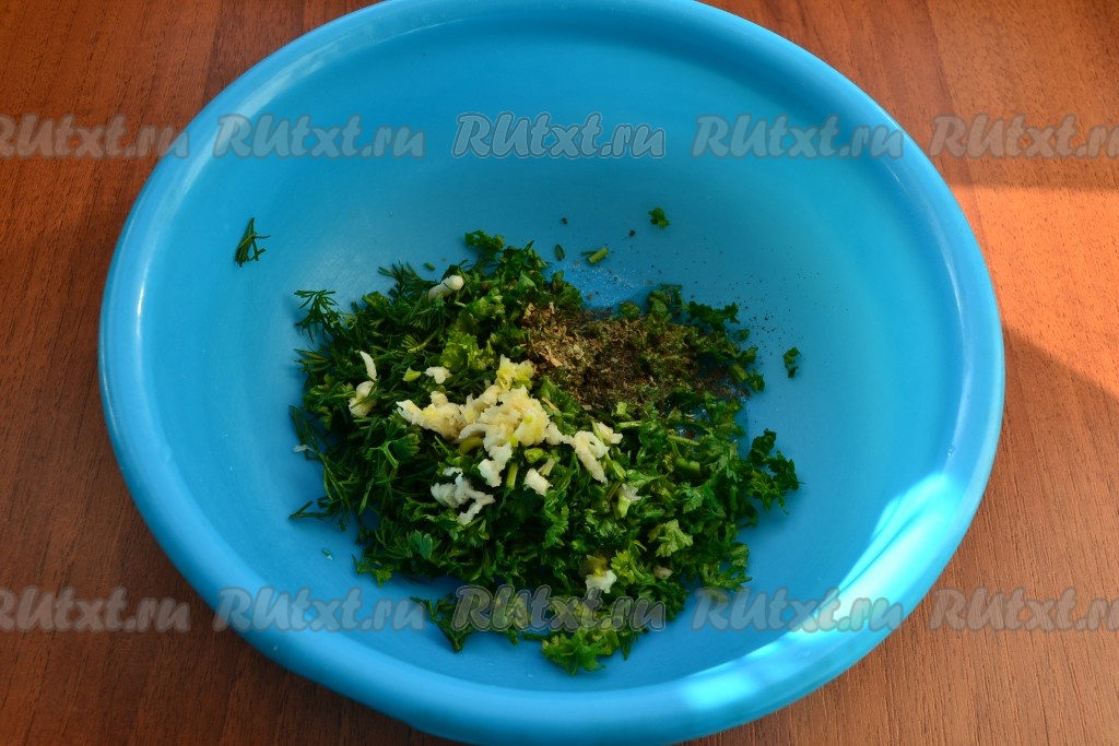 Зелень укропа и петрушки мелко нарезать, добавить пропущенный через пресс чеснок, сушеный базилик и растительное масло, перемешать.