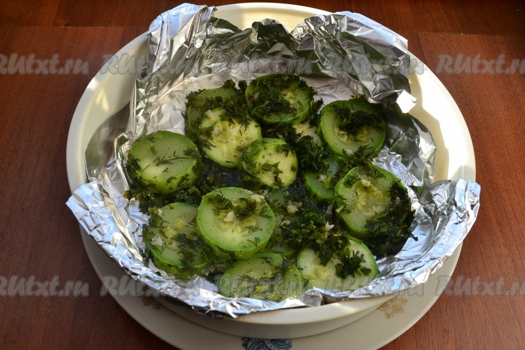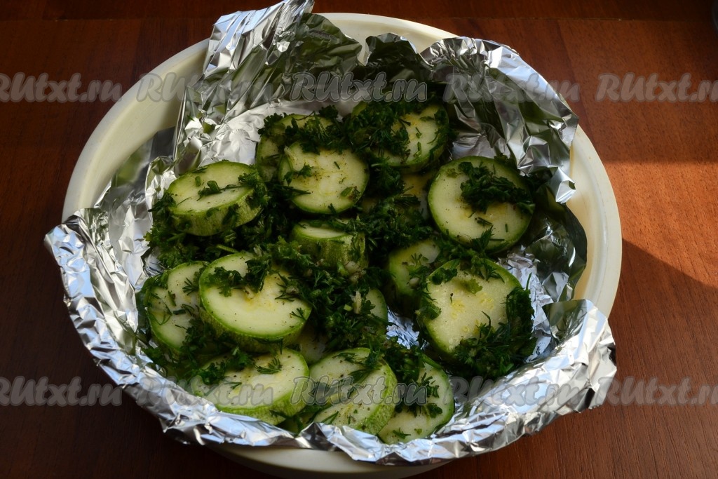 Чашу для варки на пару застелить фольгой и выложить кабачки с зеленью.