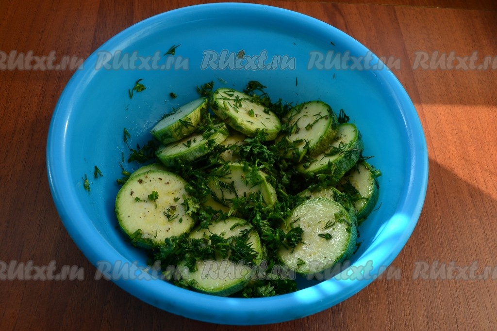 Смешать кабачки с зеленой смесью и оставить минут на 10-15.