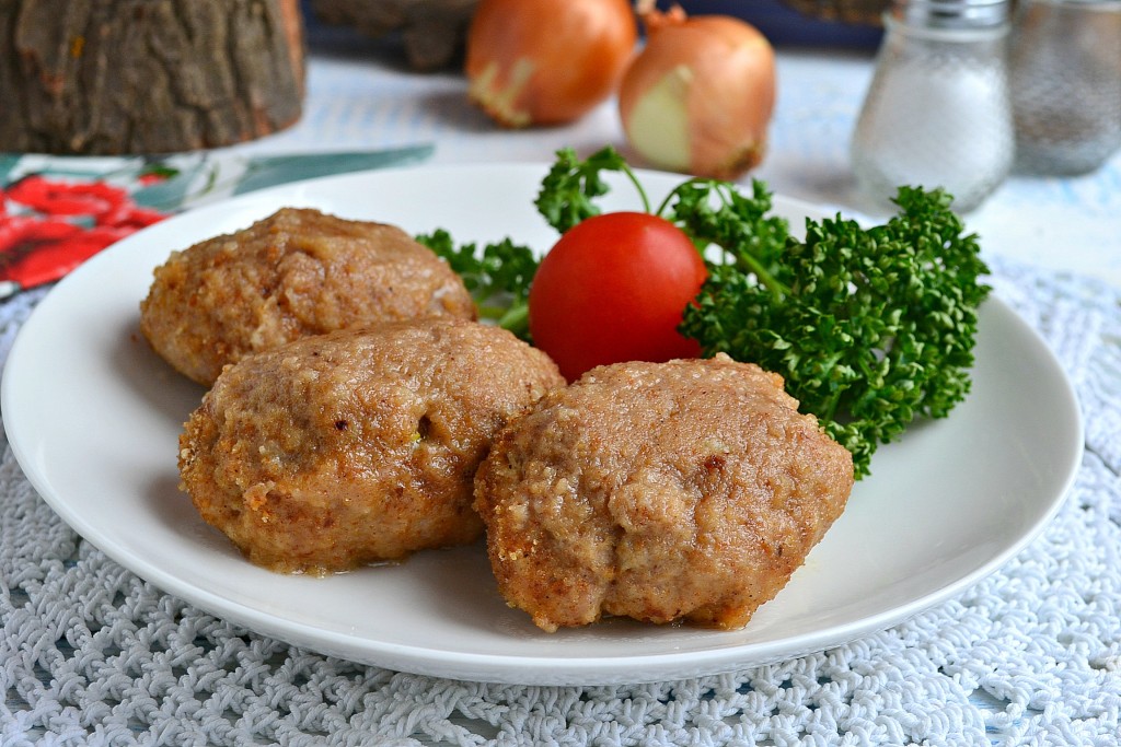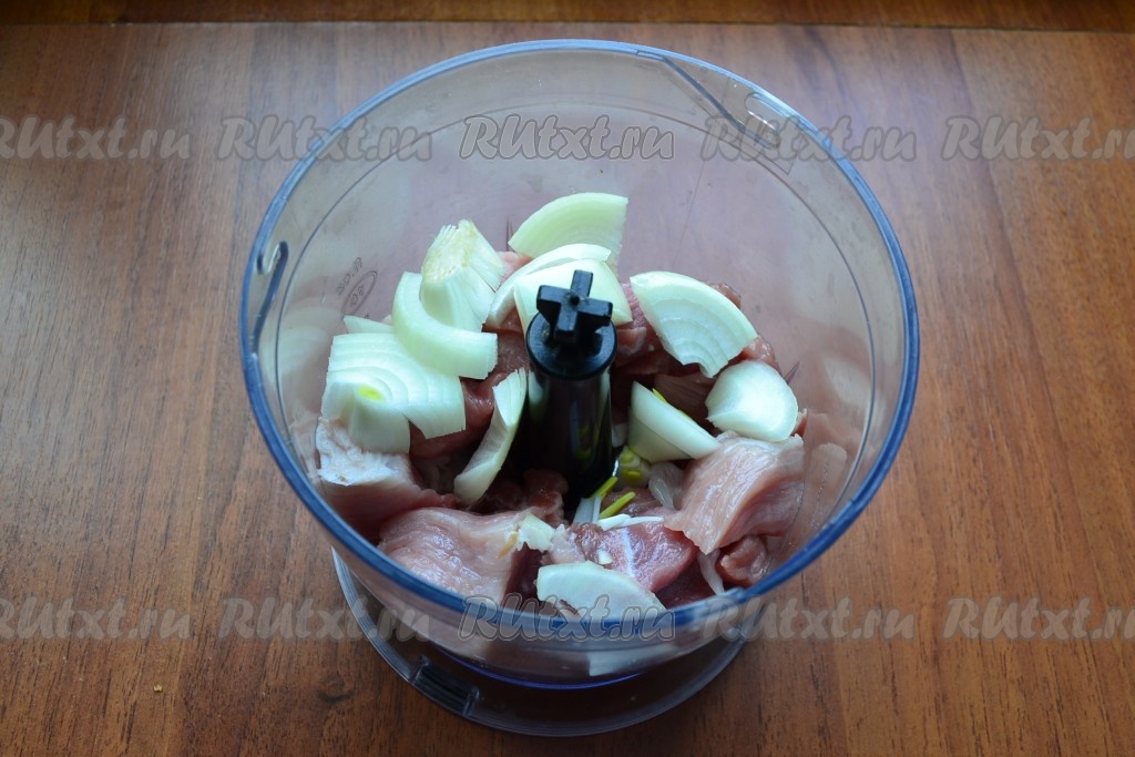 Измельчить все до состояния фарша. Если нет блендера, можно пропустить мясо и лук через мясорубку.