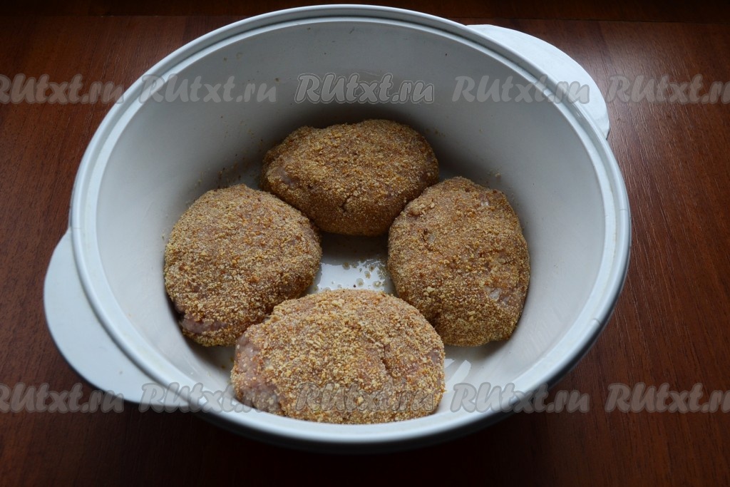 Фарш тщательно вымешать и хорошенько отбить. Сформировать котлеты средней величины, обвалять их в панировочных сухарях.