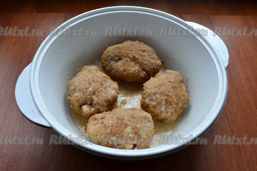 Сложить котлеты в форму или кастрюльку, смазанную растительным маслом и предназначенную для СВЧ.