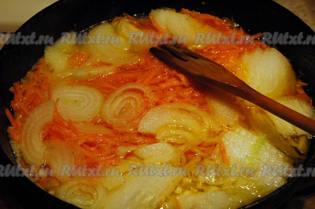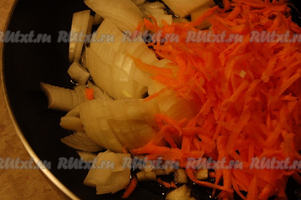 Для маринада натереть на крупной терке морковь и нарезать кольцами репчатый лук.