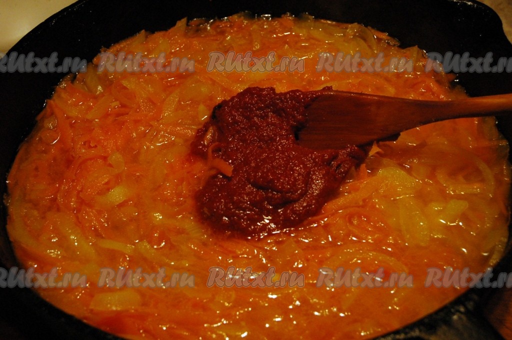 Затем добавить уксус, томатную пасту, лавровый лист, перец, соль и сахар. Попробовать.