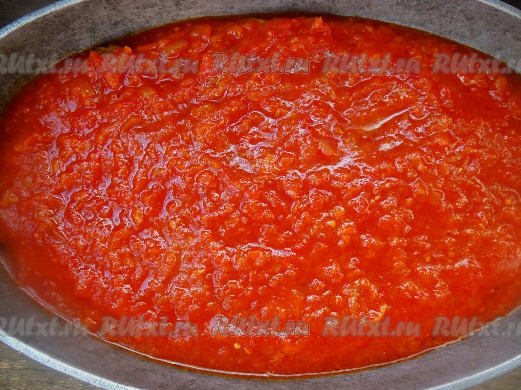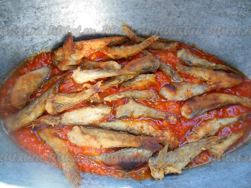 На дно толстостенной кастрюли (или утятницы) выложите первым слоем часть томатной заправки, затем добавьте часть бычков.
