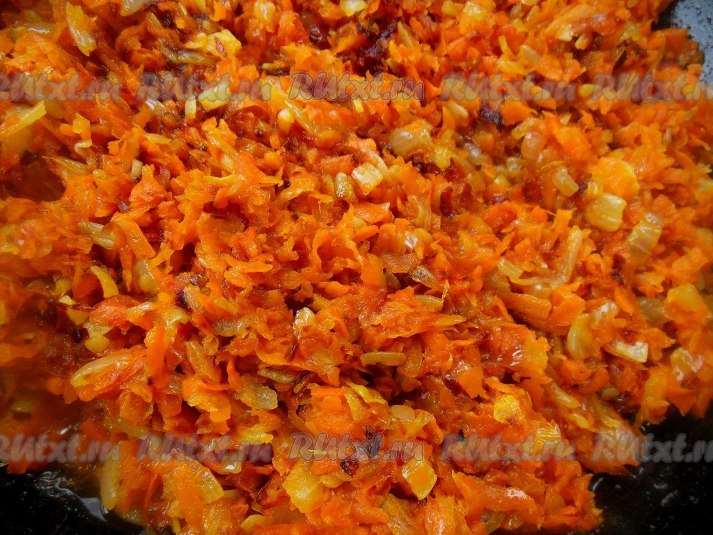 Обжарьте на сковороде с добавлением растительного масла лук и морковь до румяного цвета, иногда помешивая.
