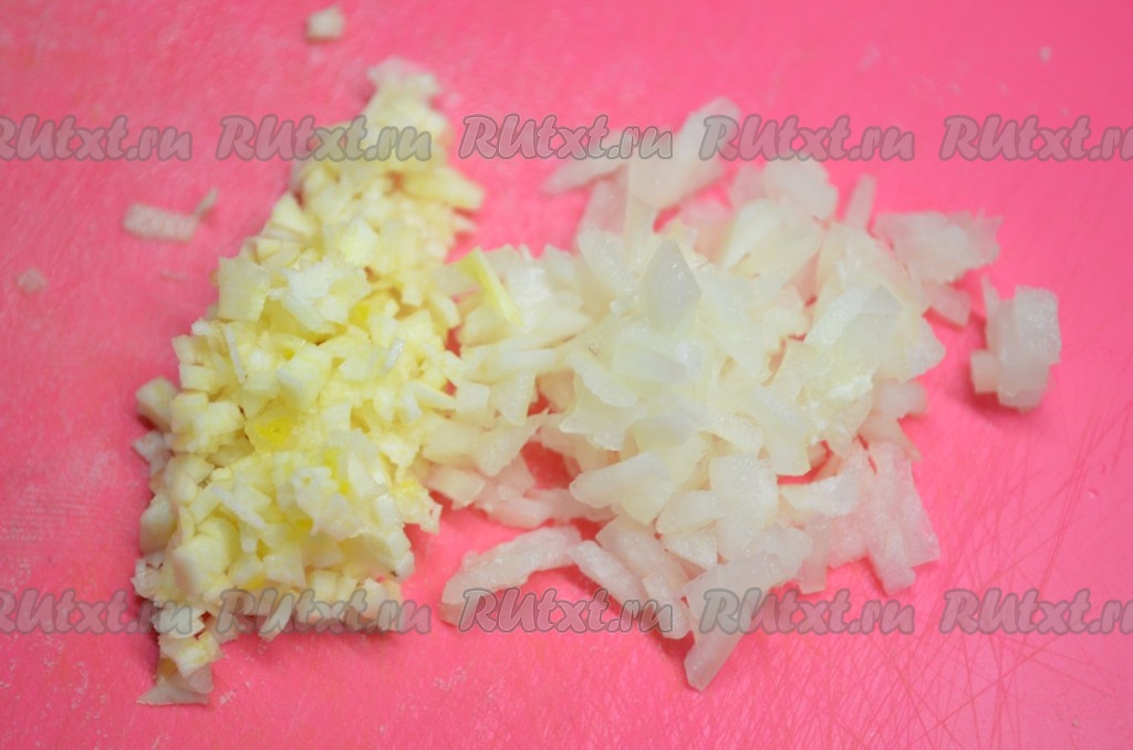 Лук и чеснок измельчить ножом (количество регулируйте по своему вкусу).