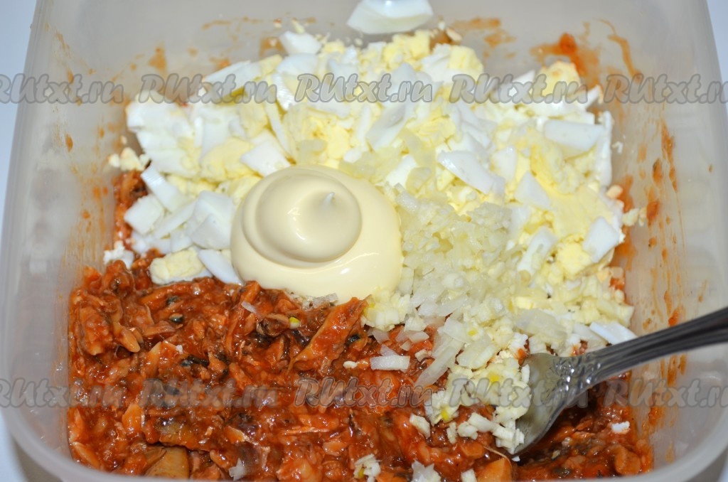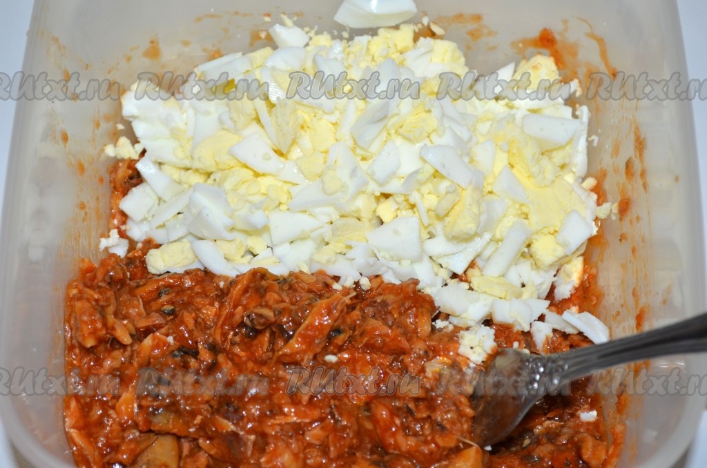 Яйца очистить, мелко нарезать, добавить к рыбе.