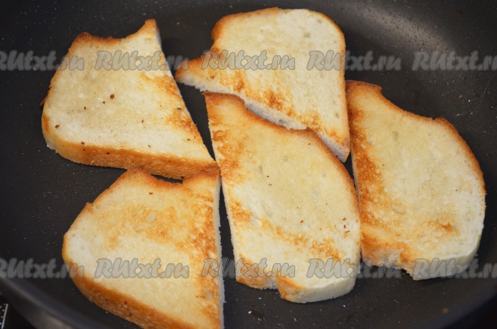 Батон нарезать на кусочки, обжарить на минимальном количестве масла с двух сторон до золотистого цвета.