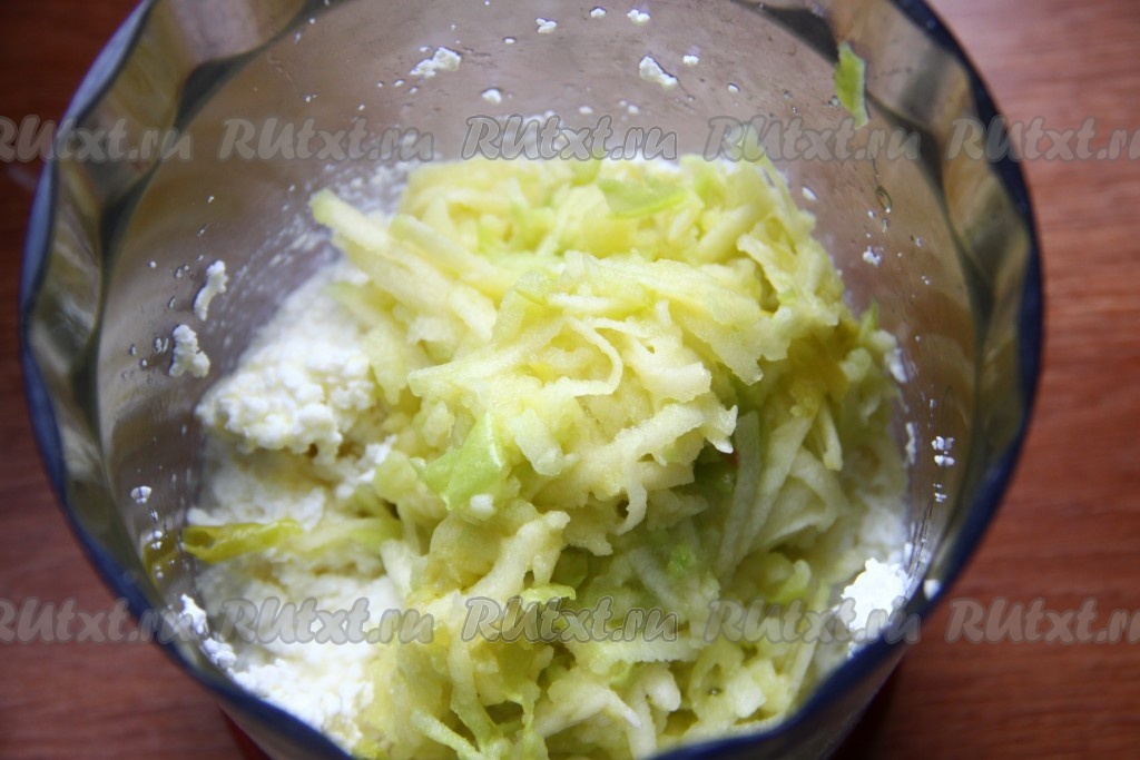 Яблоко (можно очистить от шкурки) натереть на крупной терке, добавить в творожную массу и перемешать.
