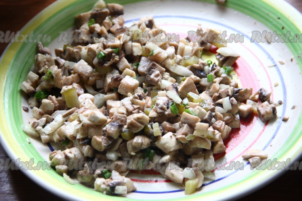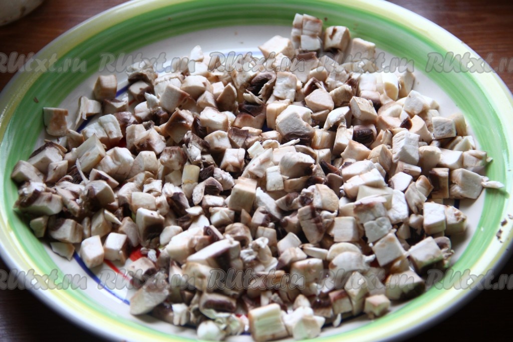 Свежие шампиньоны вымыть, обсушить и нарезать кубиками.