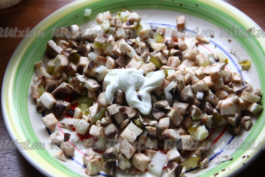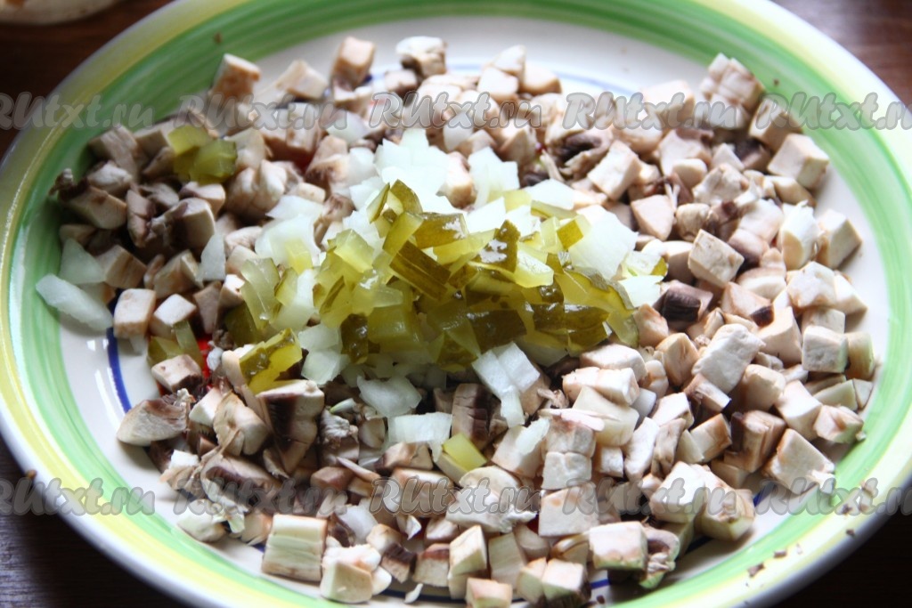 Добавить к грибам мелко нарезанную луковицу, мелко нарезанные огурцы и выдавленный чеснок.