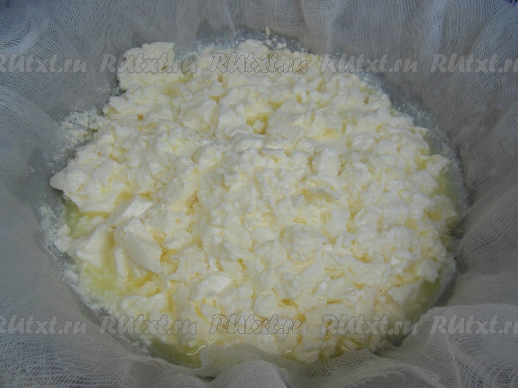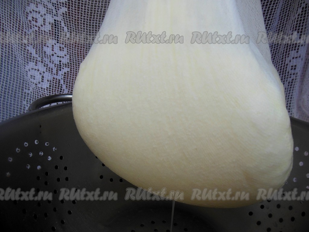 Завяжите концы марли, оставьте в дуршлаге, сверху поставьте небольшой гнет (для этого накройте марлю с творогом небольшой тарелкой, сверху поставьте гнет, например, литровую банку с водой), либо подвесьте марлю с творогом (но так сыворотка медленнее будет стекать). Оставьте творог на 3-4 часа, затем освободите его от марли, уберите в пищевой контейнер. Хранить творог нужно в холодильнике.