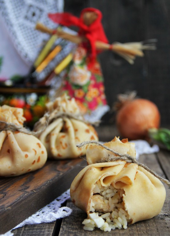 Блинчики - частые гости в нашем доме. Если честно, стараюсь и баловать, и удивлять новыми начинками. Предлагаю приготовить вкусные и сытные блинные мешочки с начинкой из риса и курицы. Блины можно испечь по любимому рецепту, я приготовила блинчики на молоке и воде. Очень вкусно, попробуйте!