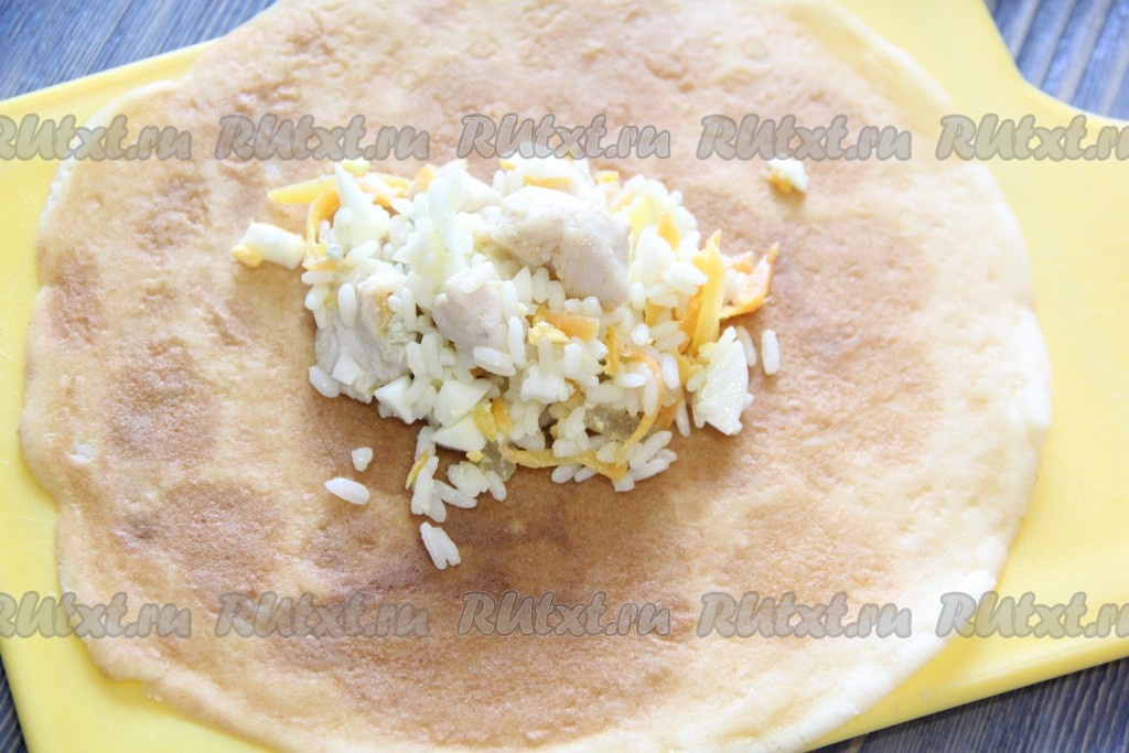 Выложить небольшое количество начинки на каждый блинчик и завернуть, как кому нравится, - в конвертик, трубочку или мешочек.