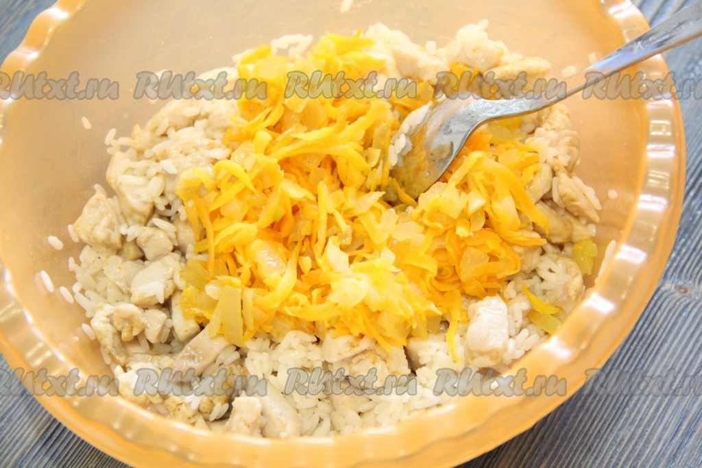 Затем к куриному мясу и рису добавить обжаренные лук с морковью, перемешать.