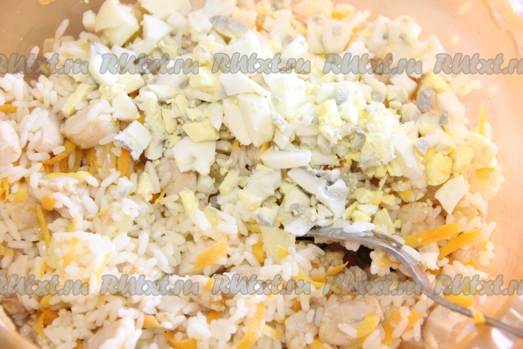 Яйца очистить, мелко порубить и добавить в смесь курицы, риса и овощей, тщательно перемешать и начинка для блинов готова.