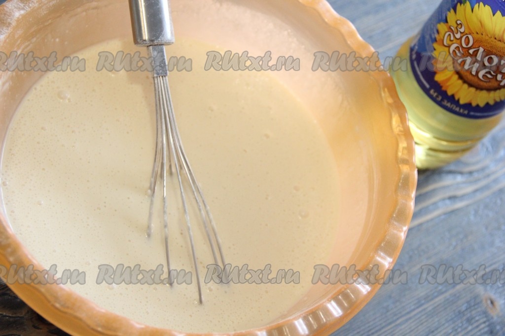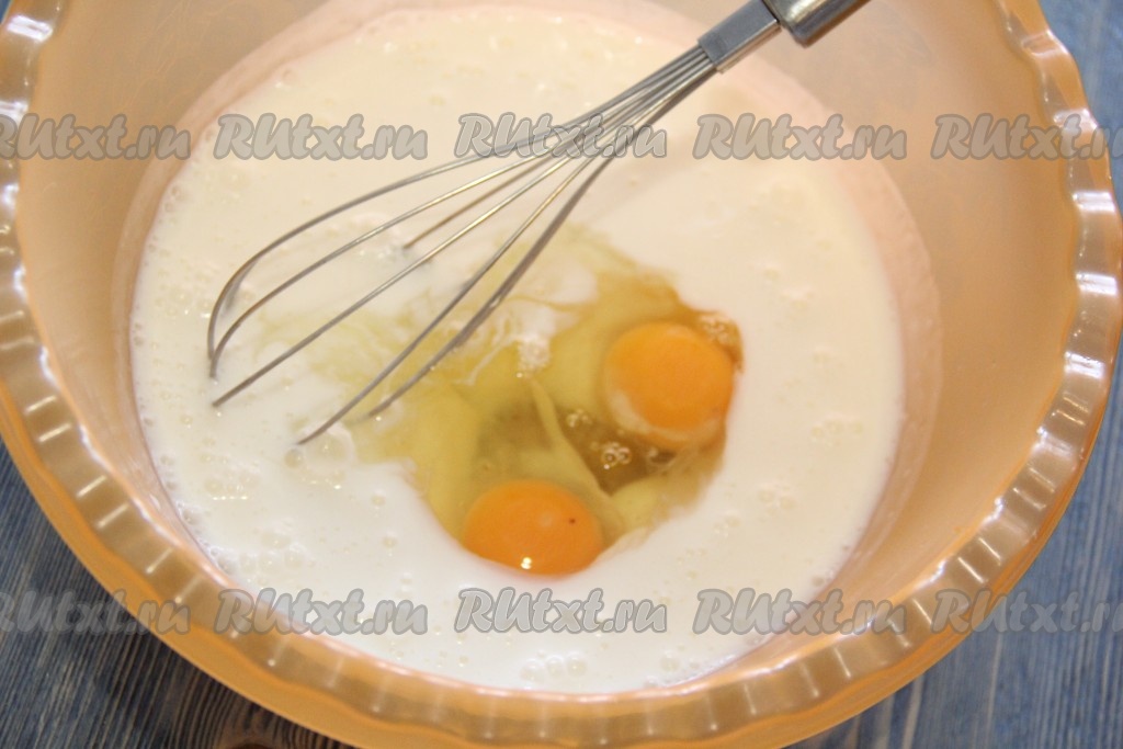 Для приготовления блинов соединить воду с молоком, добавить сахар, соль и яйца, слегка перемешать венчиком.