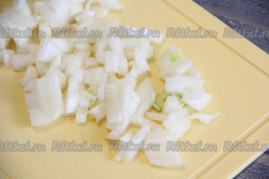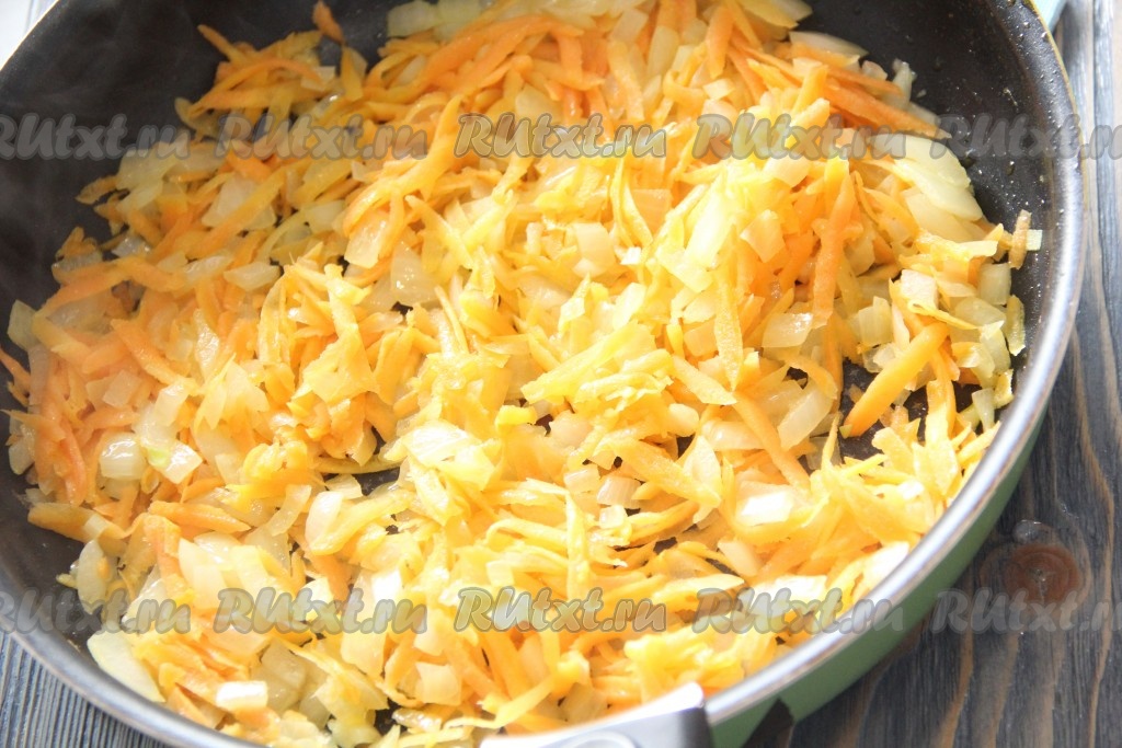 Обжарить лук с морковкой до мягкости на растительном масле, иногда помешивая, на небольшом огне.