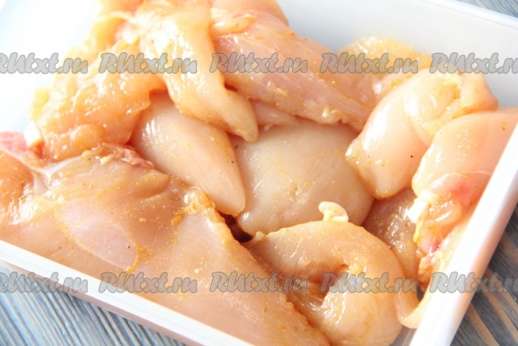 Для приготовления начинки куриное филе замариновать заранее в любом маринаде. Я филе слегка посолила, добавила по 1 столовой ложке горчицы и майонеза, перемешала и оставила мариноваться на 1 час.