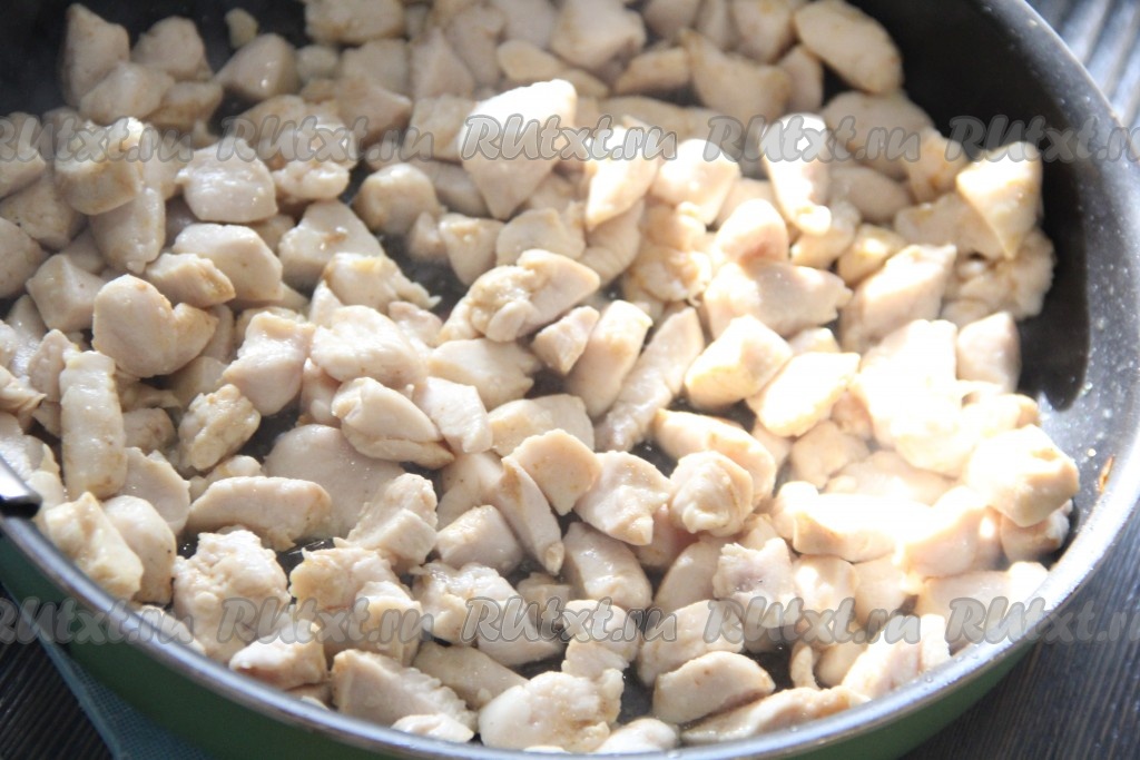 Куриное филе мелко нарезать и обжарить на среднем огне до готовности на сковороде с добавлением растительного масла.