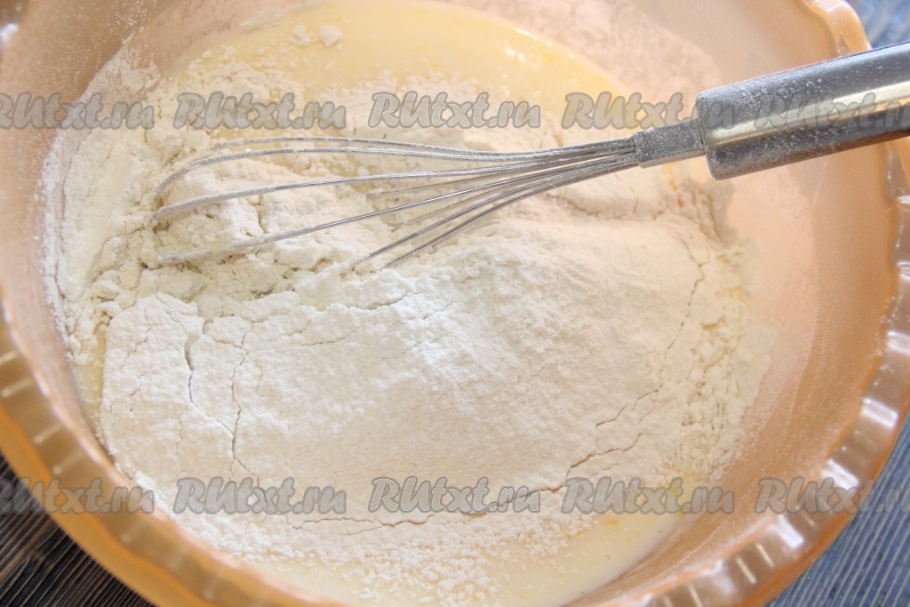 Затем всыпать просеянную муку и перемешать тесто до однородного состояния.