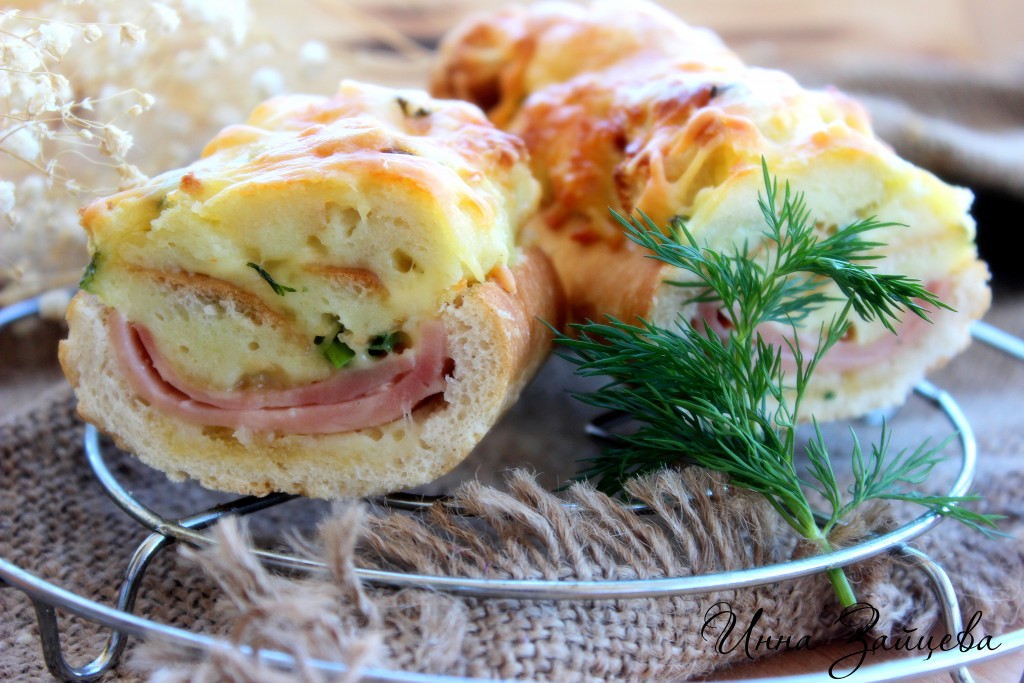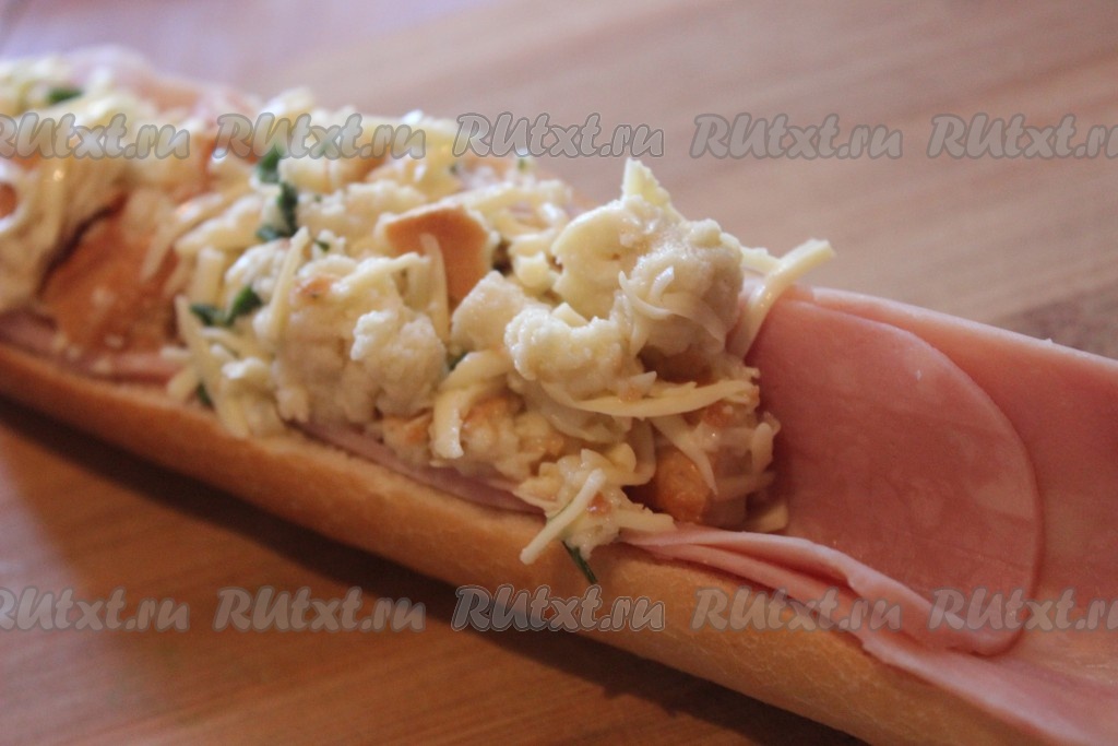 В "лодочки" из багета аккуратно выложить ломтики ветчины и пропитавшуюся начинку (если нужно, слегка отожмите её).
