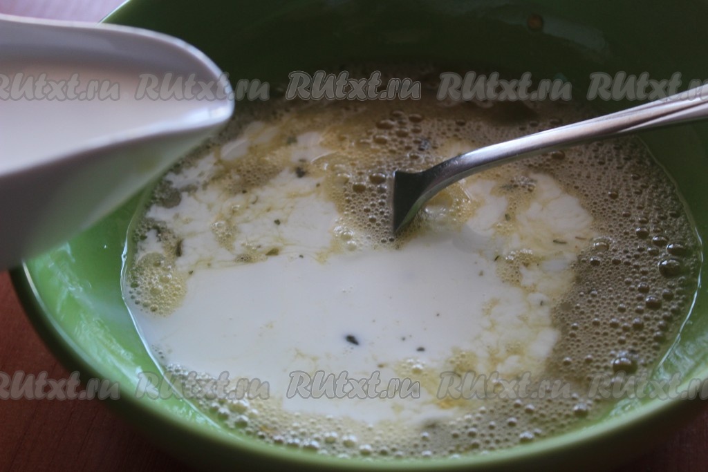 В глубокую миску вбить яйцо, посыпать любимыми специями (у меня смесь перцев), посолить, взбить при помощи вилки или венчика. Затем влить молоко и еще раз хорошо взболтать.