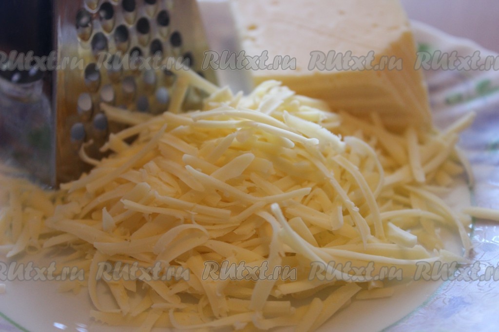 Сыр натереть на терке (натирать на крупной или мелкой тёрке - решать Вам). Я натерла на терке среднего размера. Часть натертого сыра отложить в сторонку (он нам понадобится для посыпки фаршированного багета).