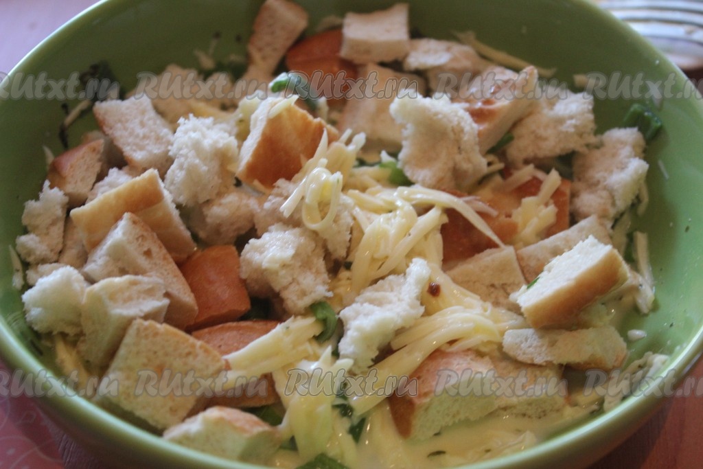 В яично-молочную смесь добавить натертый сыр, нарезанные квадратики багета и зелень, хорошо перемешать и оставить на 10 минут, чтобы начинка для багета хорошо пропиталась.