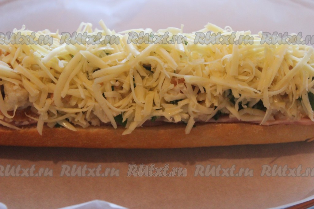 Для получения красивой корочки сверху фаршированный багет посыпать сыром и выложить на противень, застеленный пекарской бумагой. Выпекать в заранее разогретой до 180-200 градусов духовке, примерно, 15-20 минут (до появления золотистой корочки).