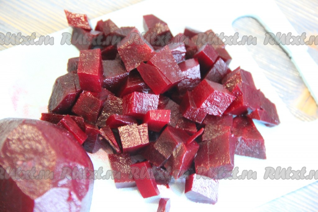 Нарезать свеклу средними кубиками.
