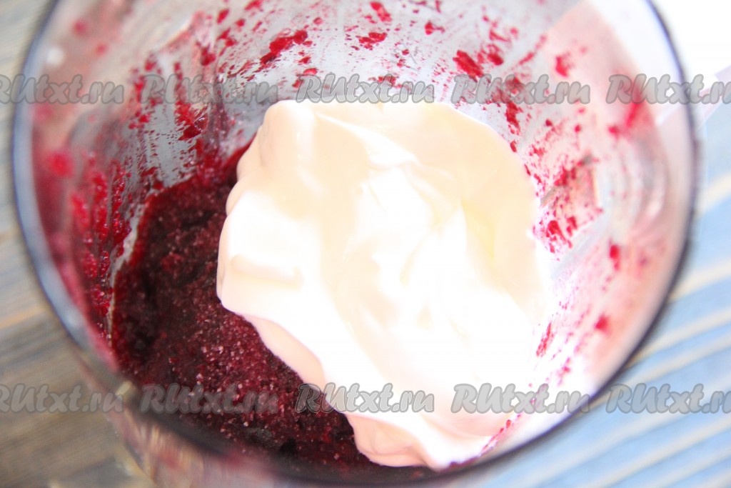 Пробить свеклу и чеснок до однородного состояния. Добавить сметану, соль и молотый перец.