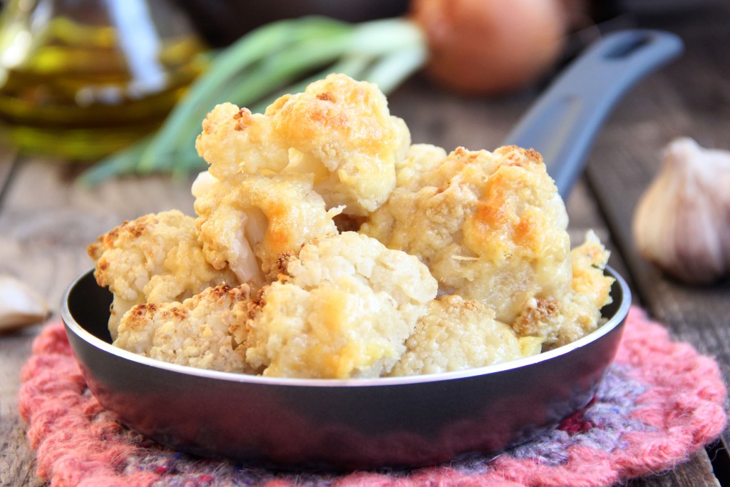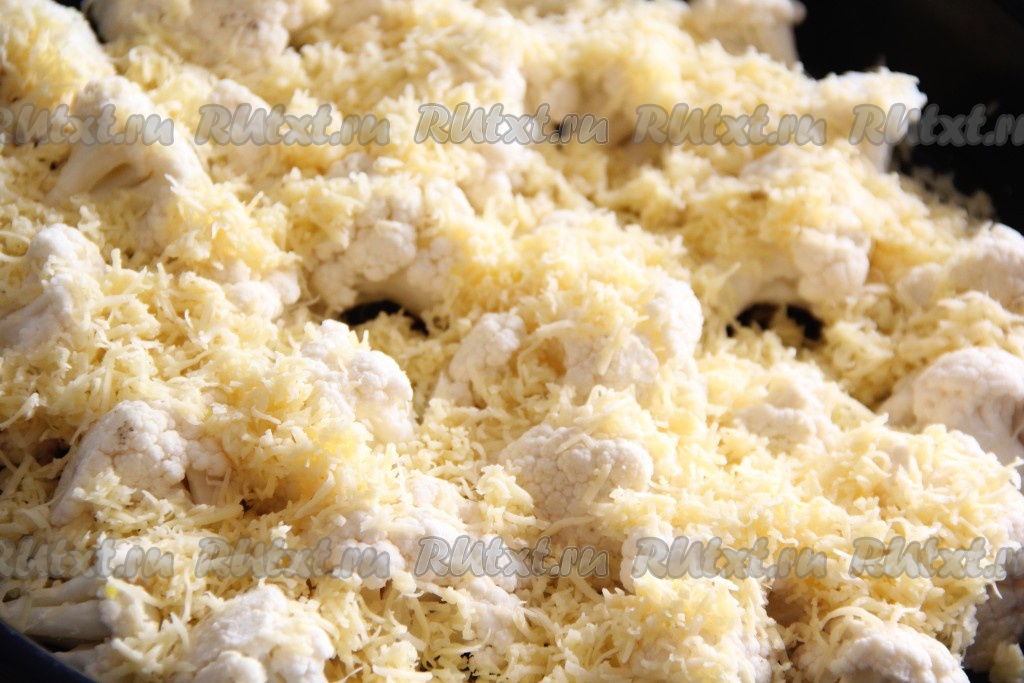 Отправить цветную капусту под сыром обратно в духовку на 10-15 минут, чтобы сыр успел образовать приятную золотистую корочку. Фольгой можно не накрывать.