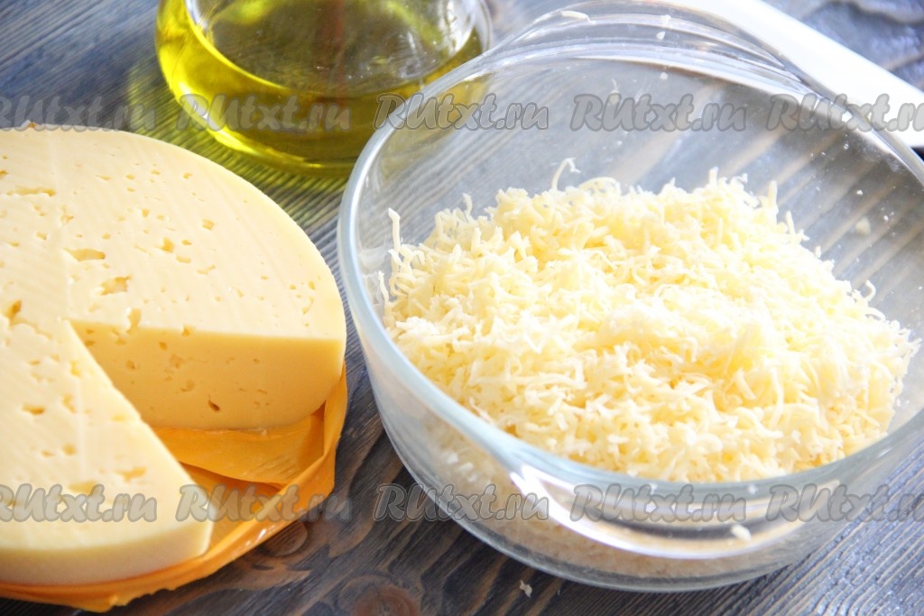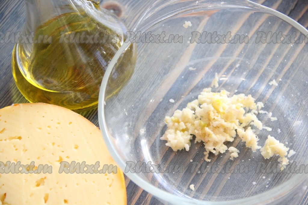 Сыр натереть на мелкой тёрке и соединить с чесноком, слегка перемешать.