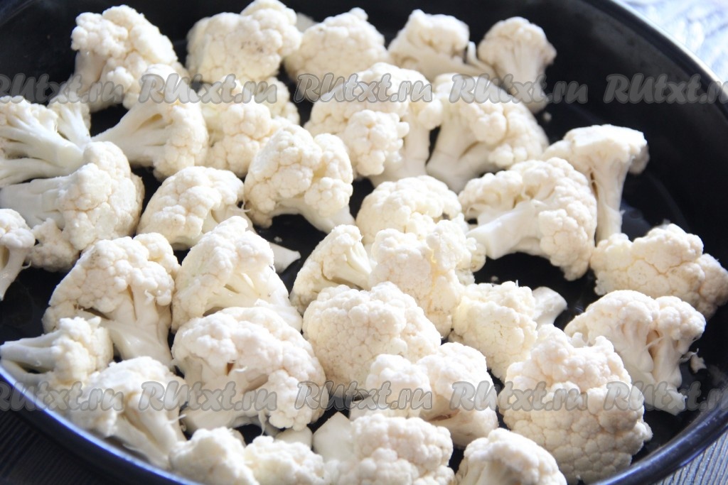 Подготовить продукты. Цветную капусту вымыть под проточной водой, убрать листья. Если используете замороженную капусту, то можно её на размораживать, но тогда готовьте её чуть дольше.