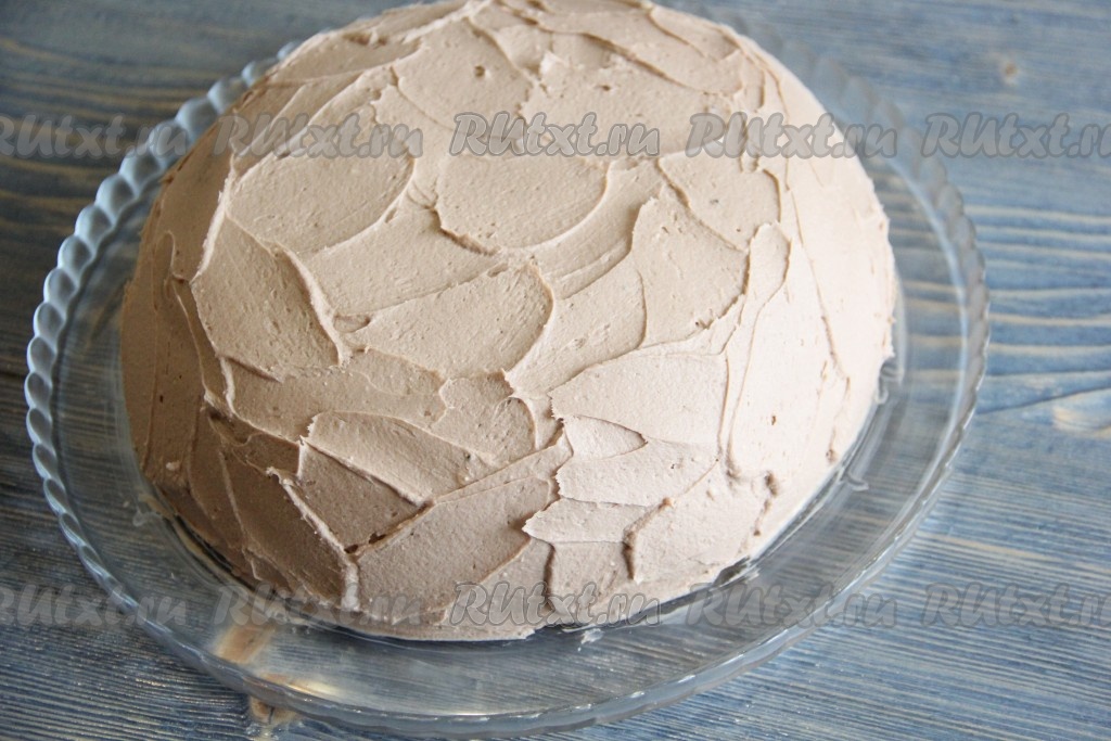 Бока и верх торта хорошо обмазать кремом. Поставить торт в холодильник на ночь.