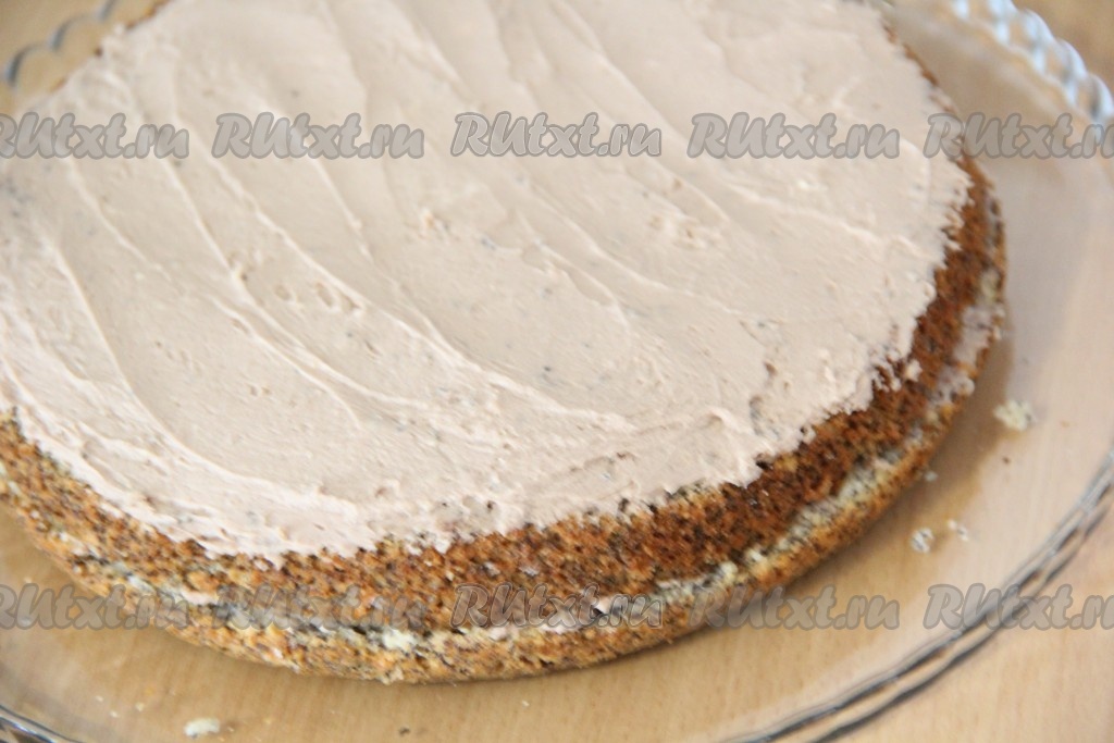 Собрать торт. Промазать коржи творожным кремом. Я дополнительно коржи не пропитывала, они получились не сухими.