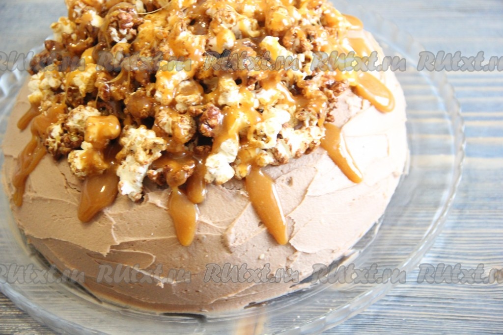 Готовый торт с кремом из творожного сыра украсить по желанию. Я украсила шоколадным попкорном и полила карамелью. Для приготовления карамели соединить 3 столовые ложки сахара, 1 столовую ложку мёда и 1 чайную ложку сливочного масла, поставить на огонь и варить до однородности на небольшом огне, помешивая, в течение 5-7 минут. Пока карамель горячая, полить торт и посыпать попокорном.