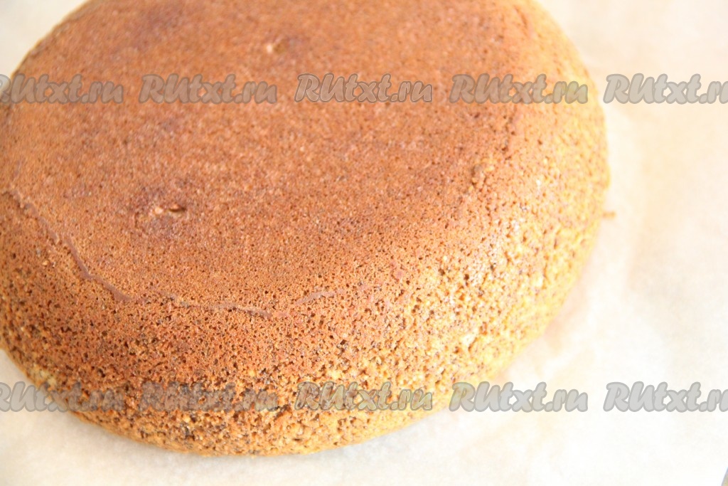 Разрезать бисквит на 4 коржа.